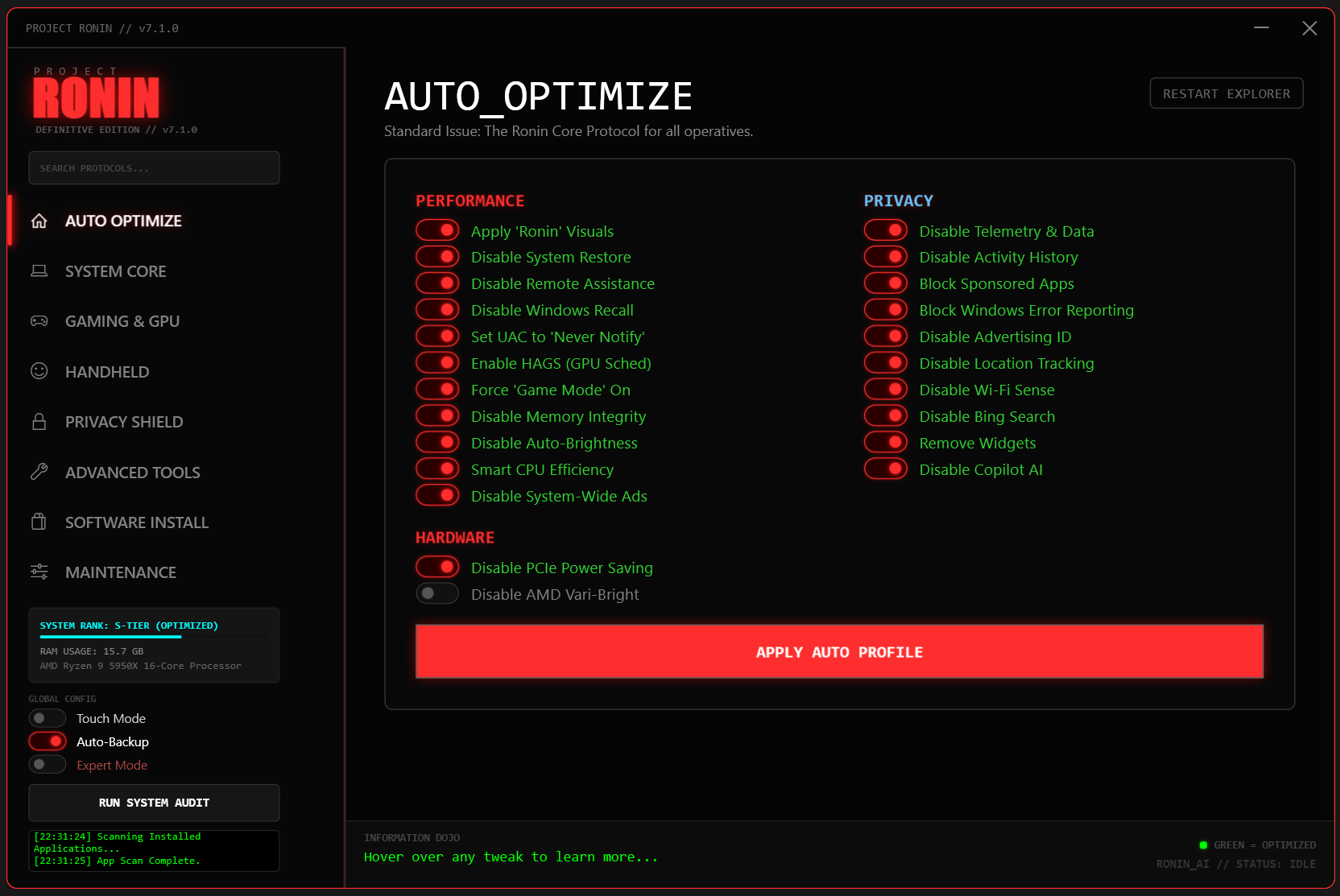 Run with one command (as admin): irm "https://raw.githubusercontent.com/keiretrogaming/Project-Ronin/main/run.ps1" | iex