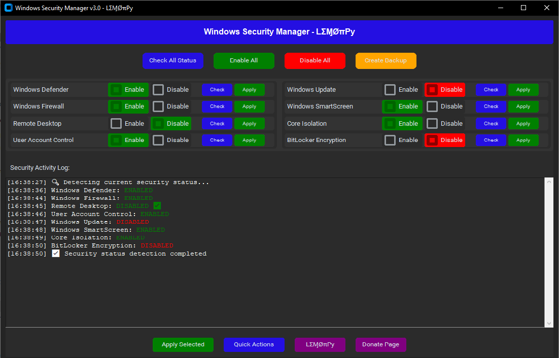 - ✅ One-click toggle for Defender, Firewall, UAC